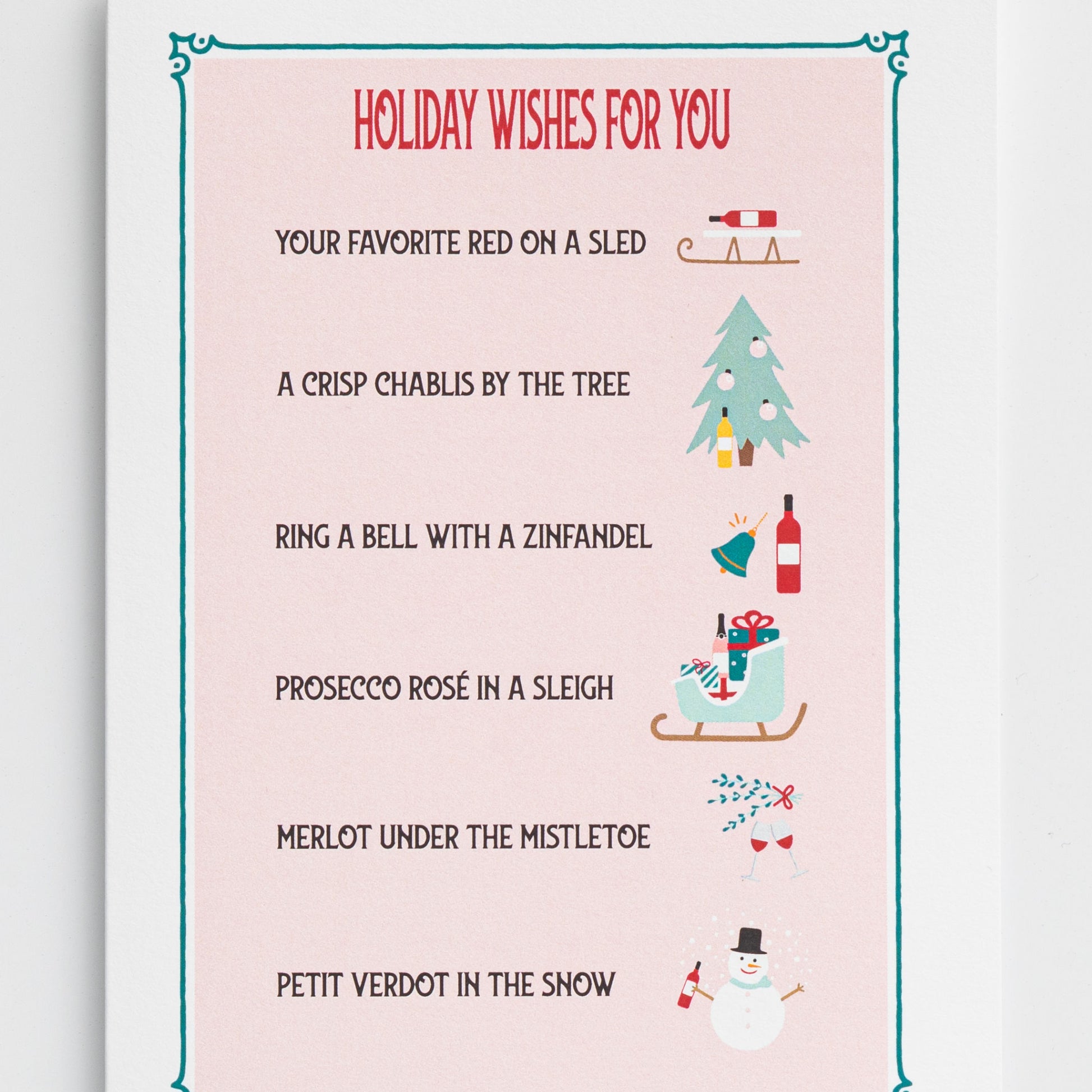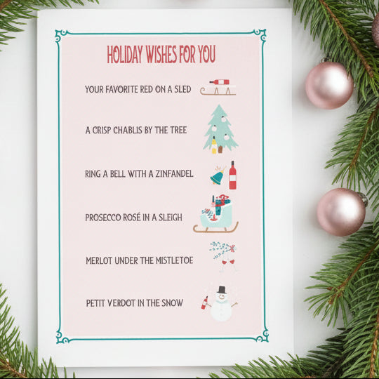 Your favorite red on a sled, a crisp Chablis by the tree...these are a few of the holiday wishes featured on our wine lovers holiday greeting card. Pair this card with a bottle of wine to bring to your next holiday party and let your wine lover friends know that they are seen.