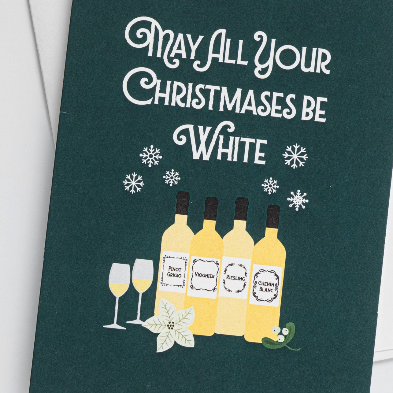 Some wine lovers fall strictly into one of two camps. This niche, Christmas greeting card is for white wine enthusiasts only! Designed by us and printed in the US on heavy 5 x 7" cardstock, it features a collection of white wines set against a dark green background.